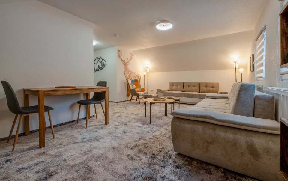 This apartment is located opposite the reception, always a few steps outside and up a flight of stairs. Inside the house it is located on the ground floor. This apartment is equipped with 2 bathrooms (shower), 3 bedrooms, a cozy living area and fully equipped kitchen with seating area. (Kitchen: electric hob with 2 cooking zones, refrigerator, microwave, filter coffee machine, kettle and kitchen utensils).
