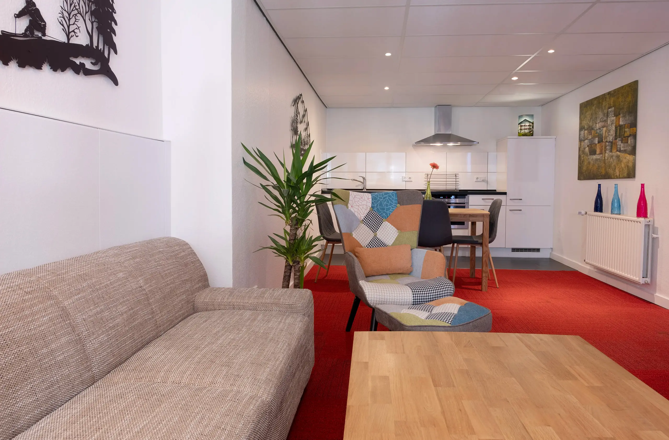 This apartment is equipped with 1 bathroom (shower), separate toilet, 2 bedrooms, cozy living area and fully equipped kitchen with seating area. (Kitchen: stove with 4 cooking zones, dishwasher, refrigerator, oven, filter coffee machine, kettle and kitchen utensils).