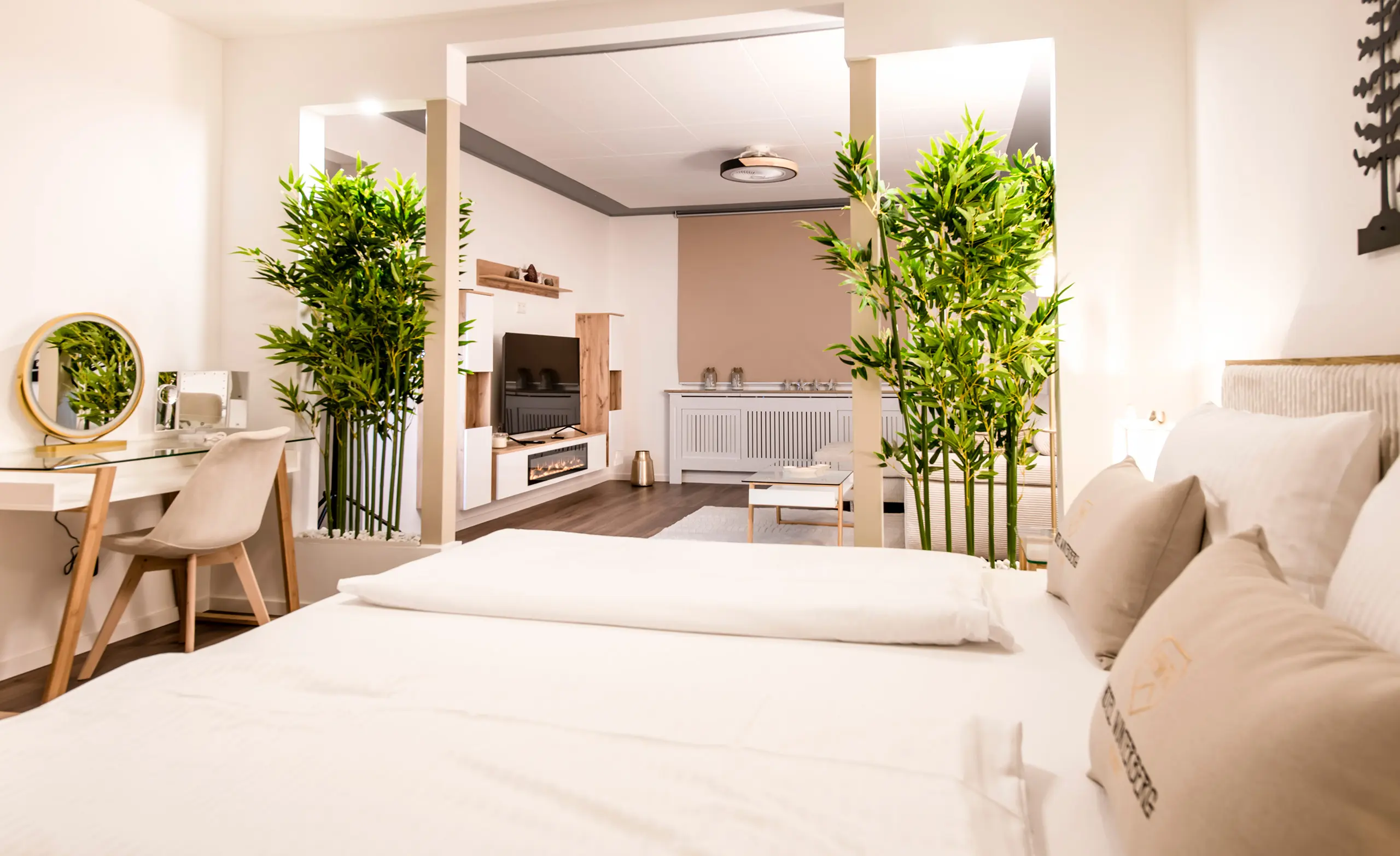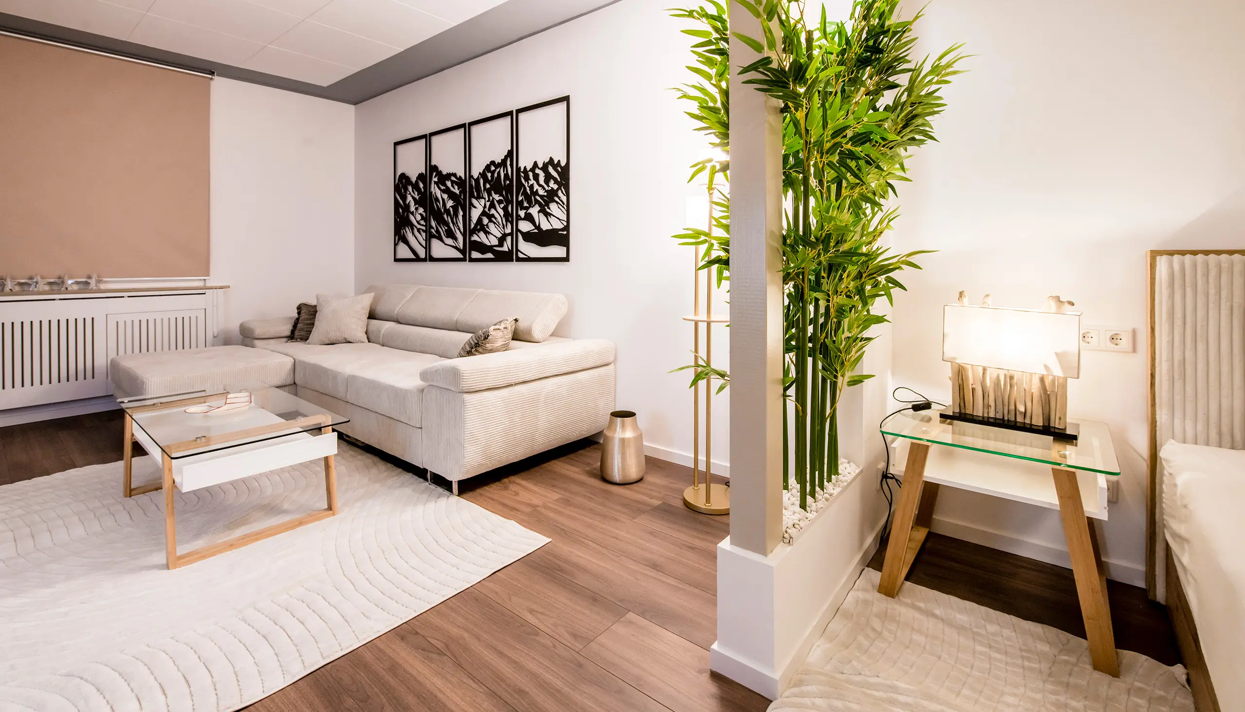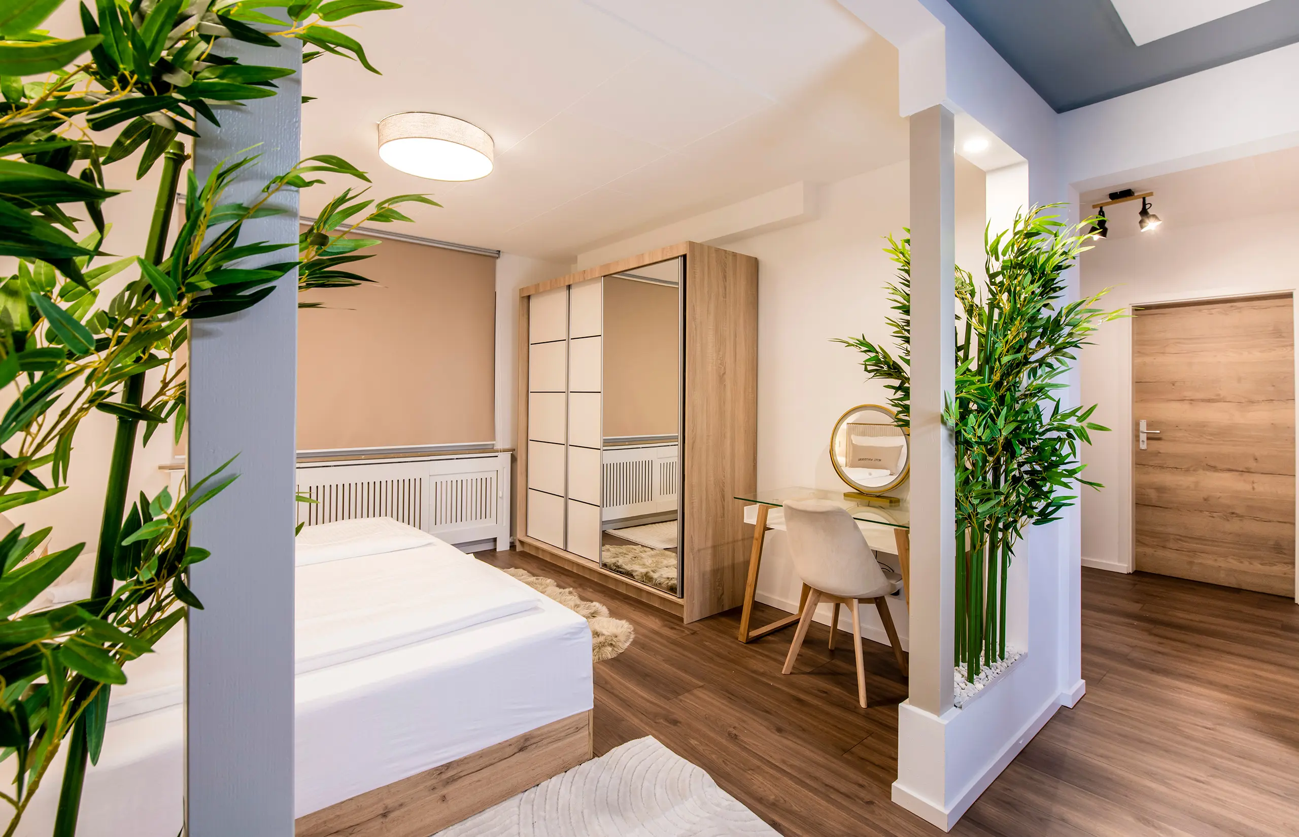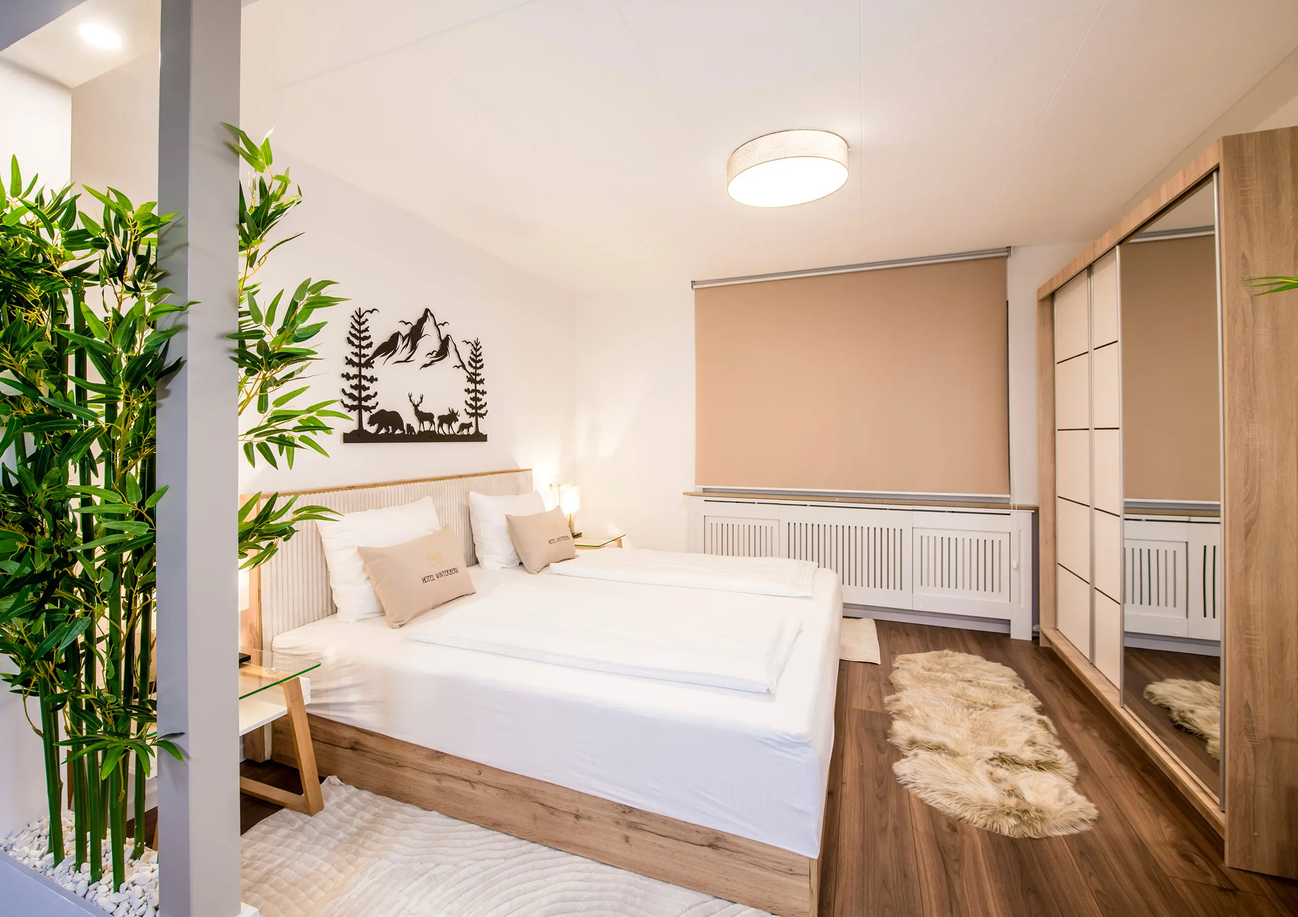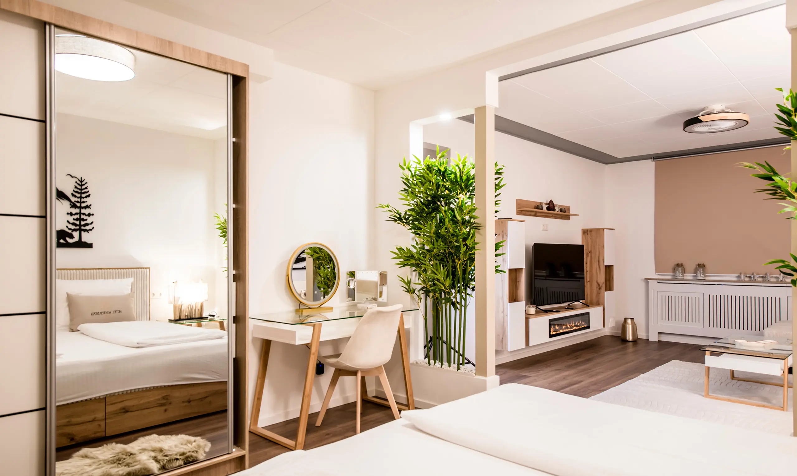 Located in a quiet position within “House 5” directly opposite the hotel, this 45 m² Junior Suite on the ground floor offers a stylish and cozy retreat. It is ideal for couples or small families of up to 3 people.