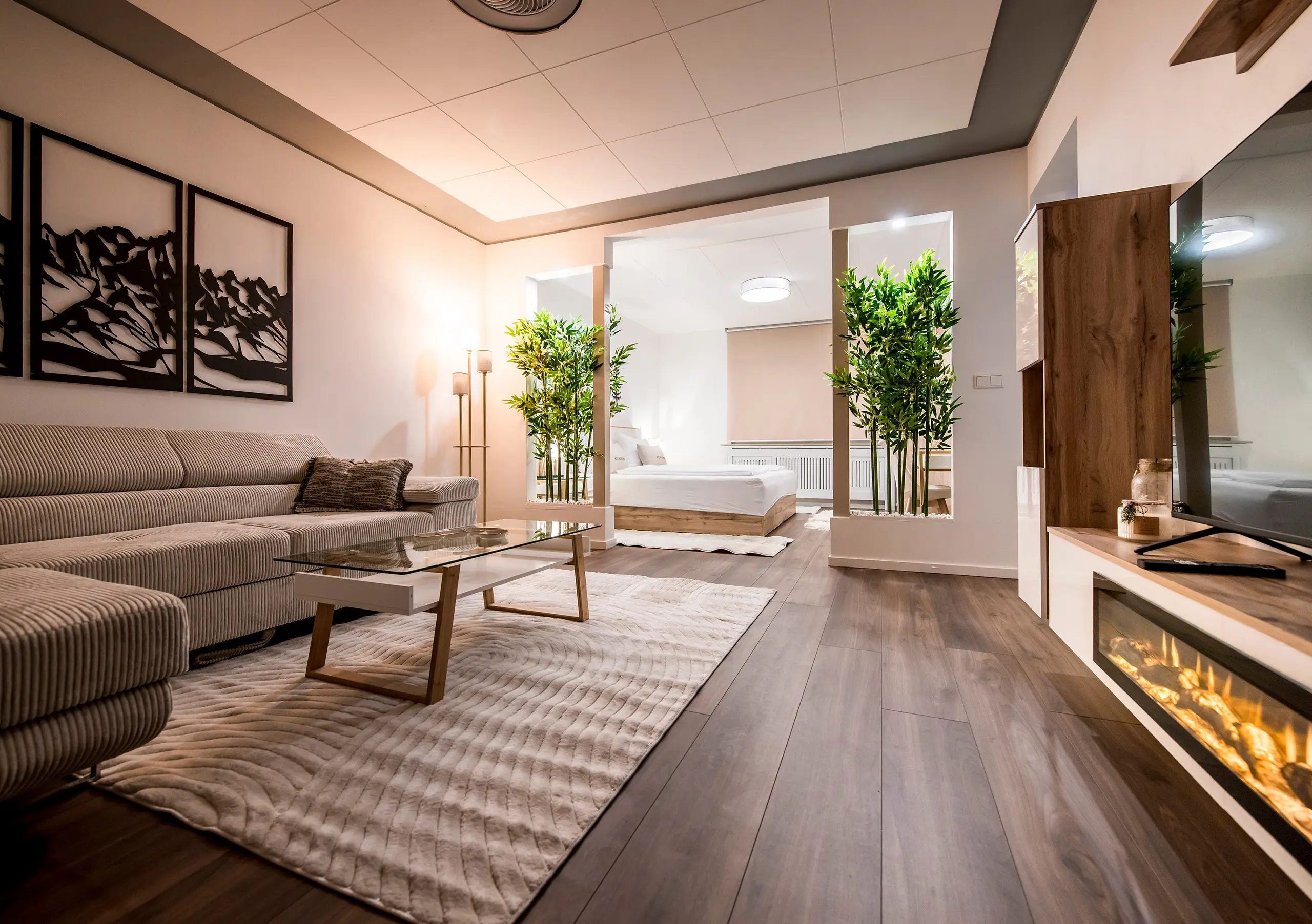 Living & Relaxing: The suite features a spacious sitting area designed for comfort. It is equipped with a large sofa, an LCD TV, and a fireplace that adds a touch of warmth and luxury to the room.