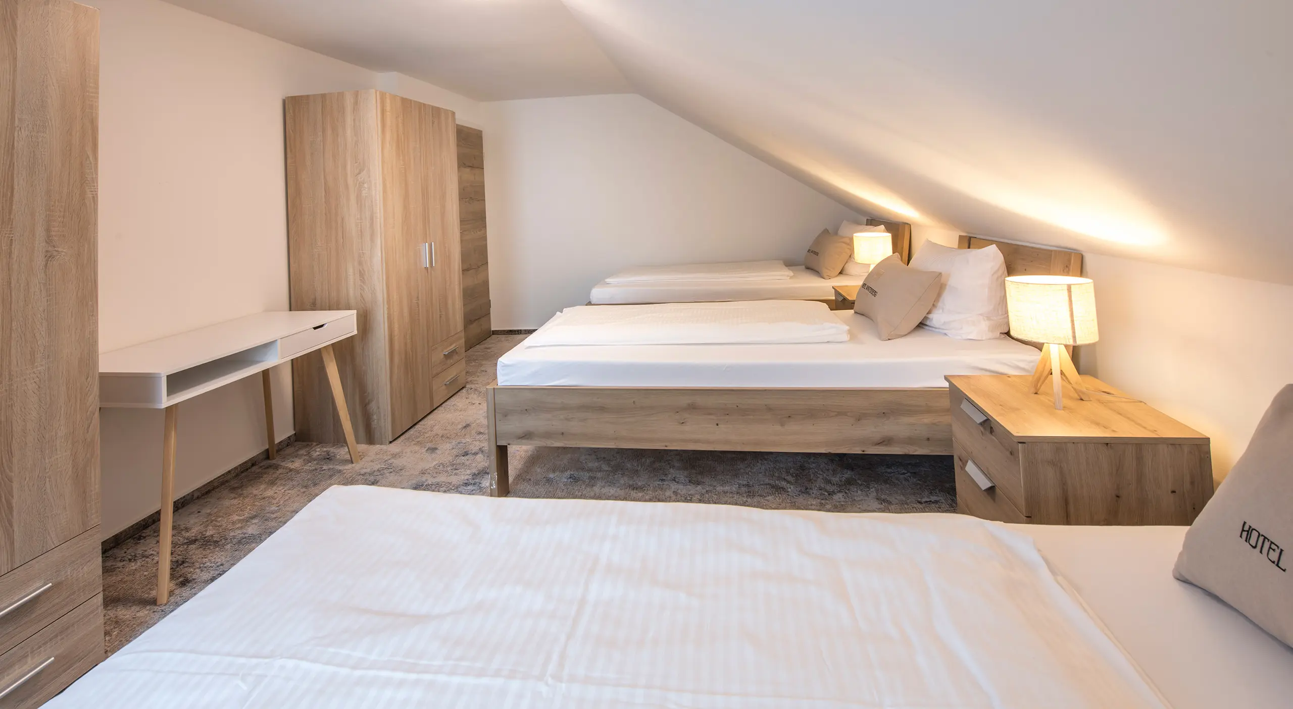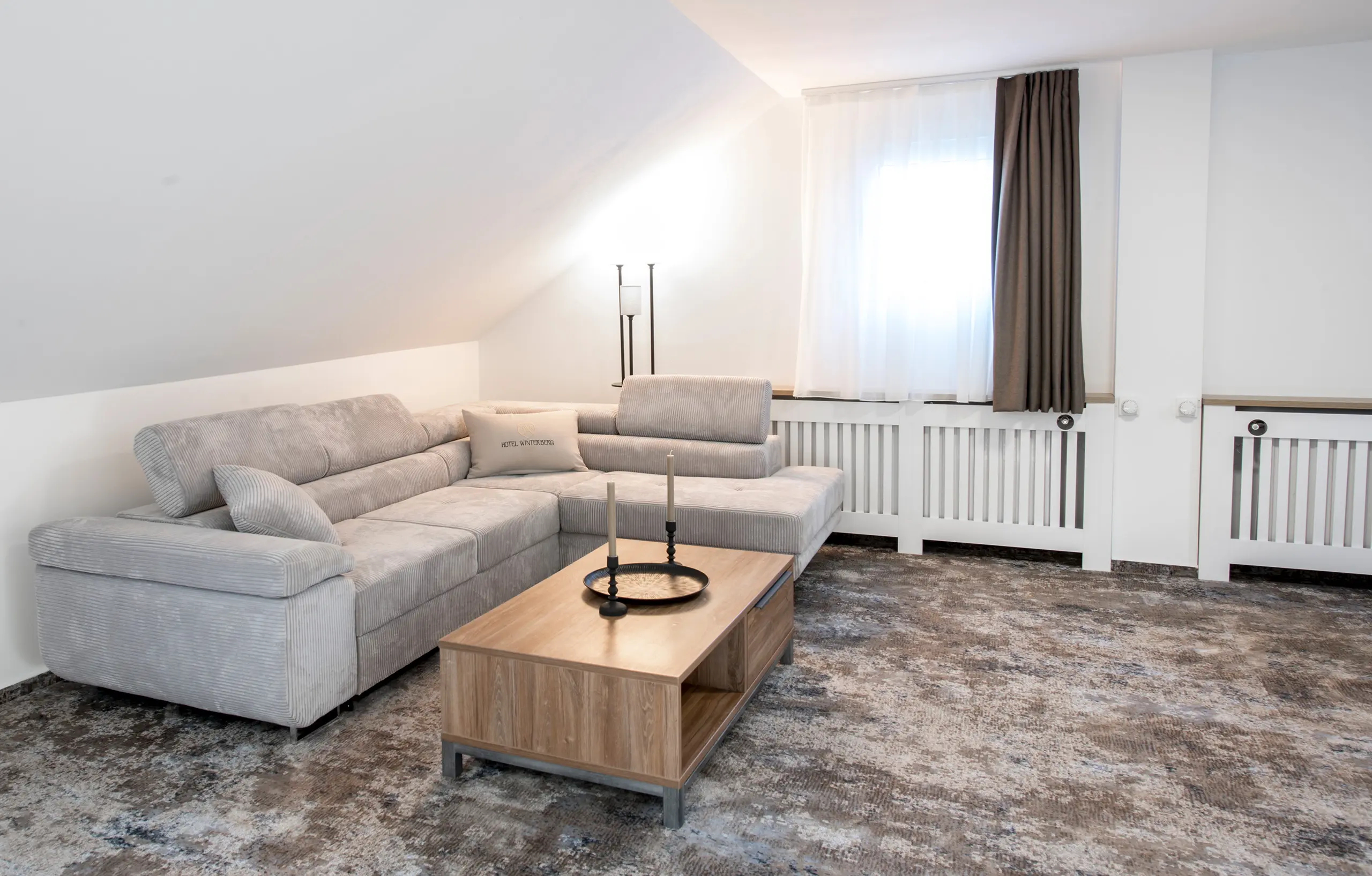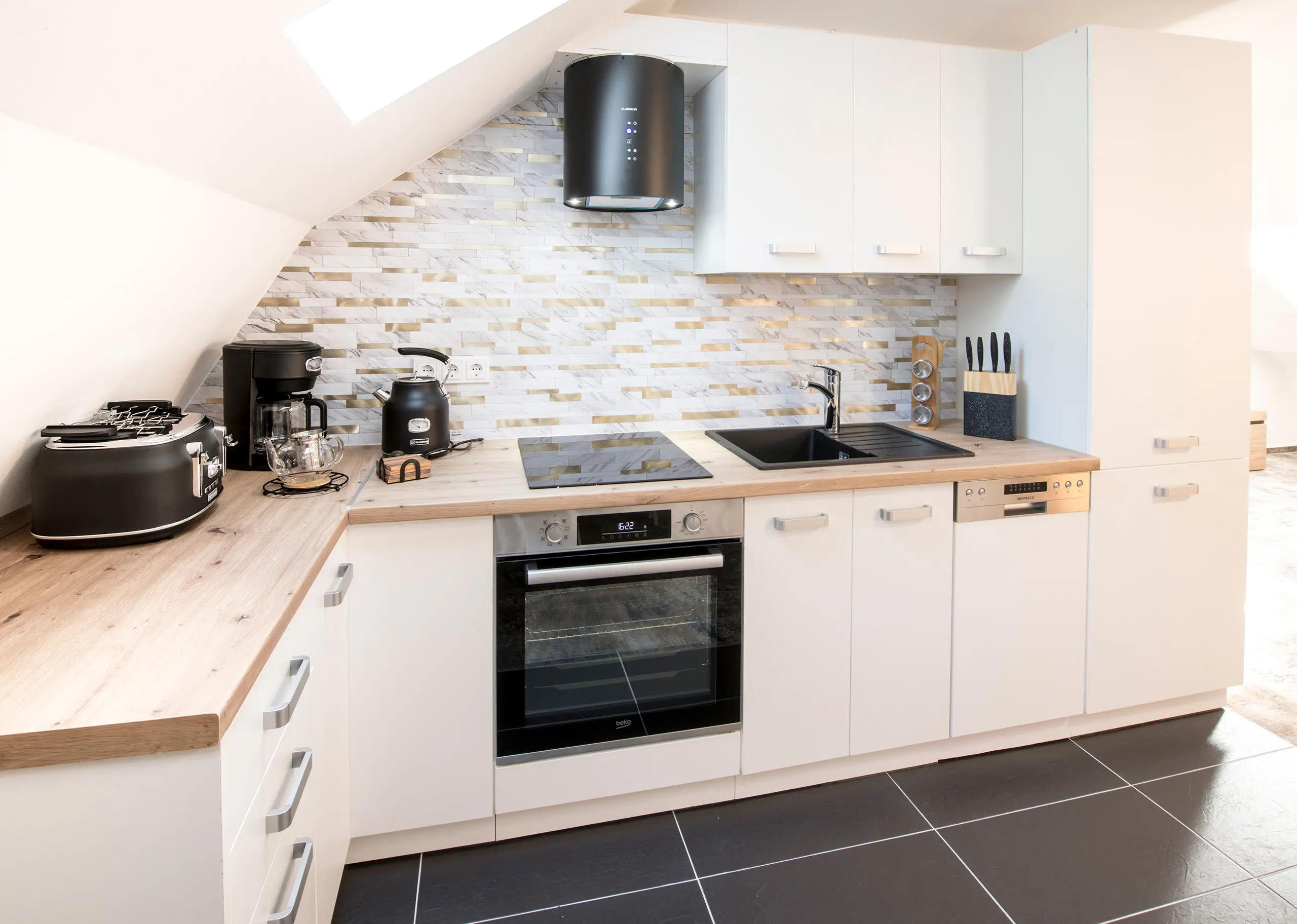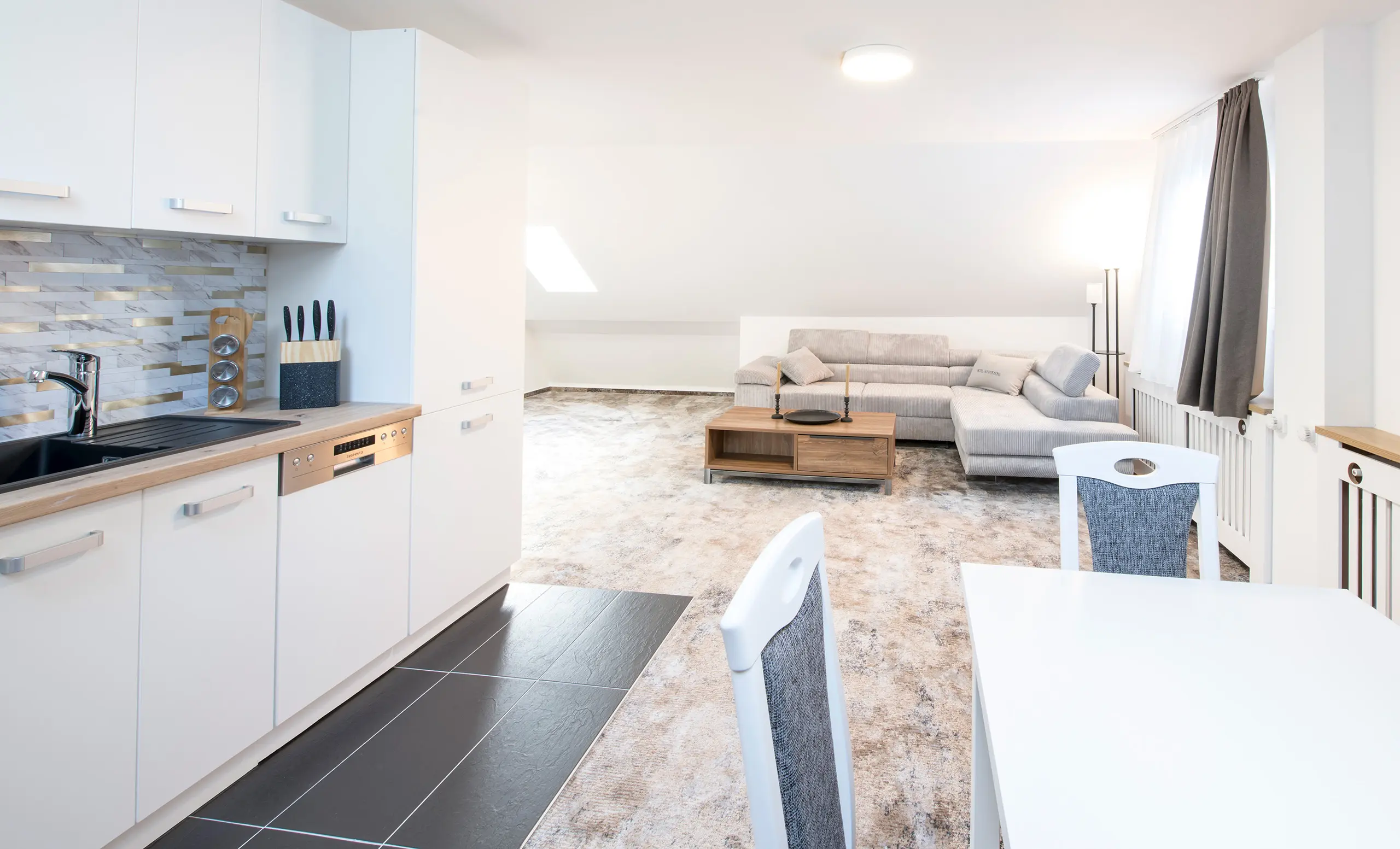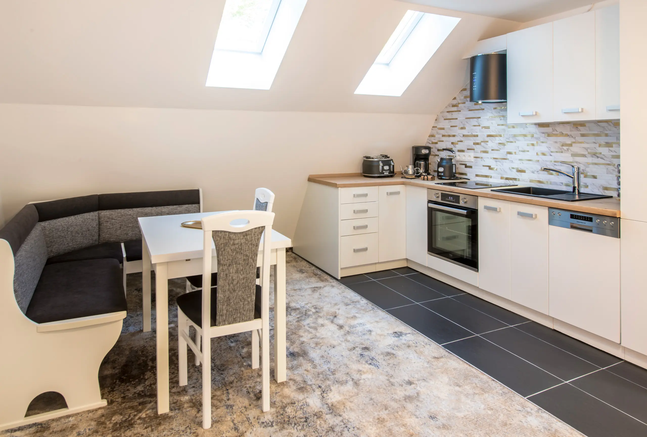 Diese geräumige, 90 m² große Ferienwohnung befindet sich im 1. Obergeschoss direkt gegenüber dem Hotel und bietet einen komfortablen und gut ausgestatteten Rückzugsort. Mit viel Platz und umfassender Ausstattung ist sie ideal für Familien oder Gruppen von bis zu 5 Personen.