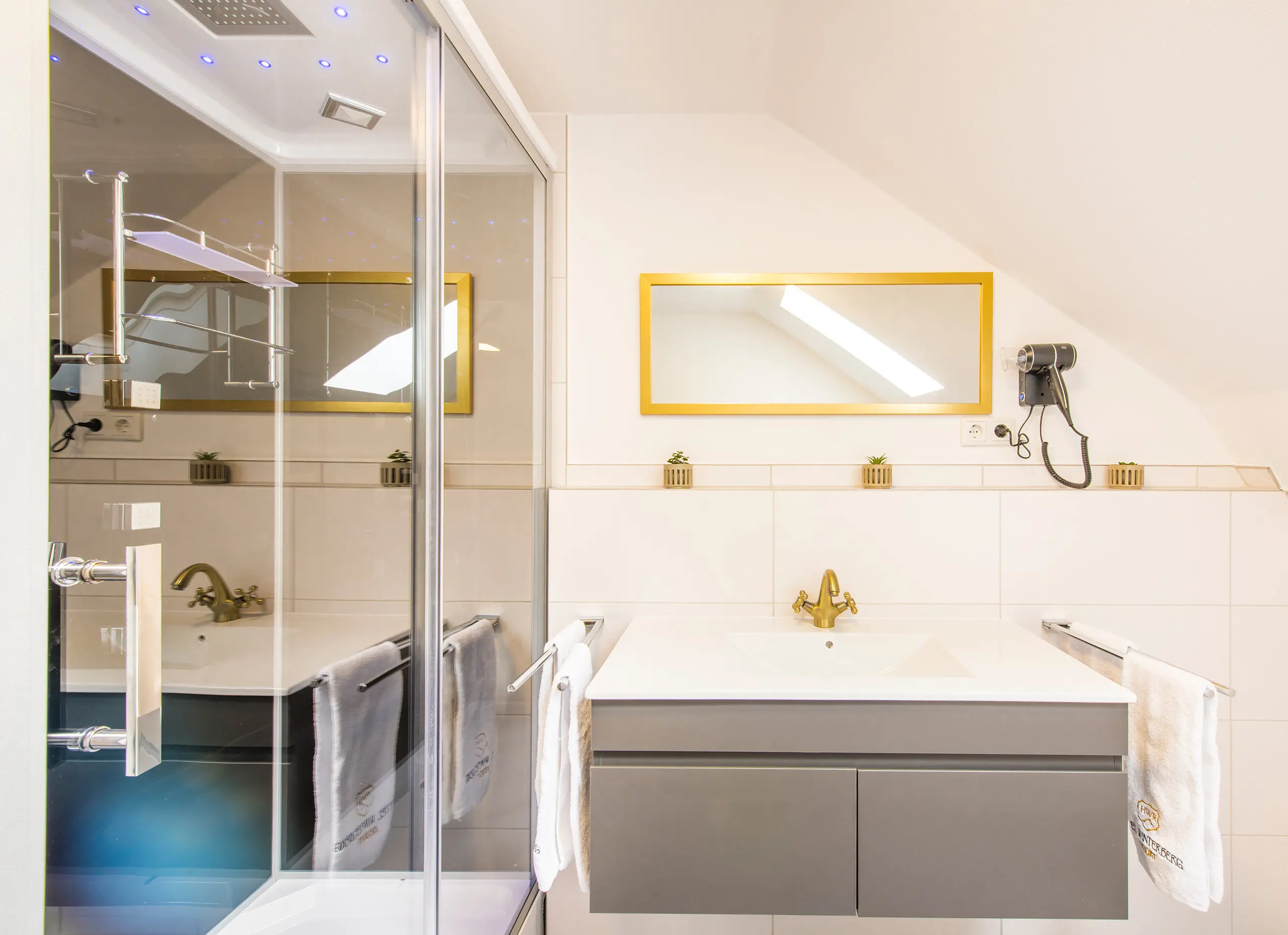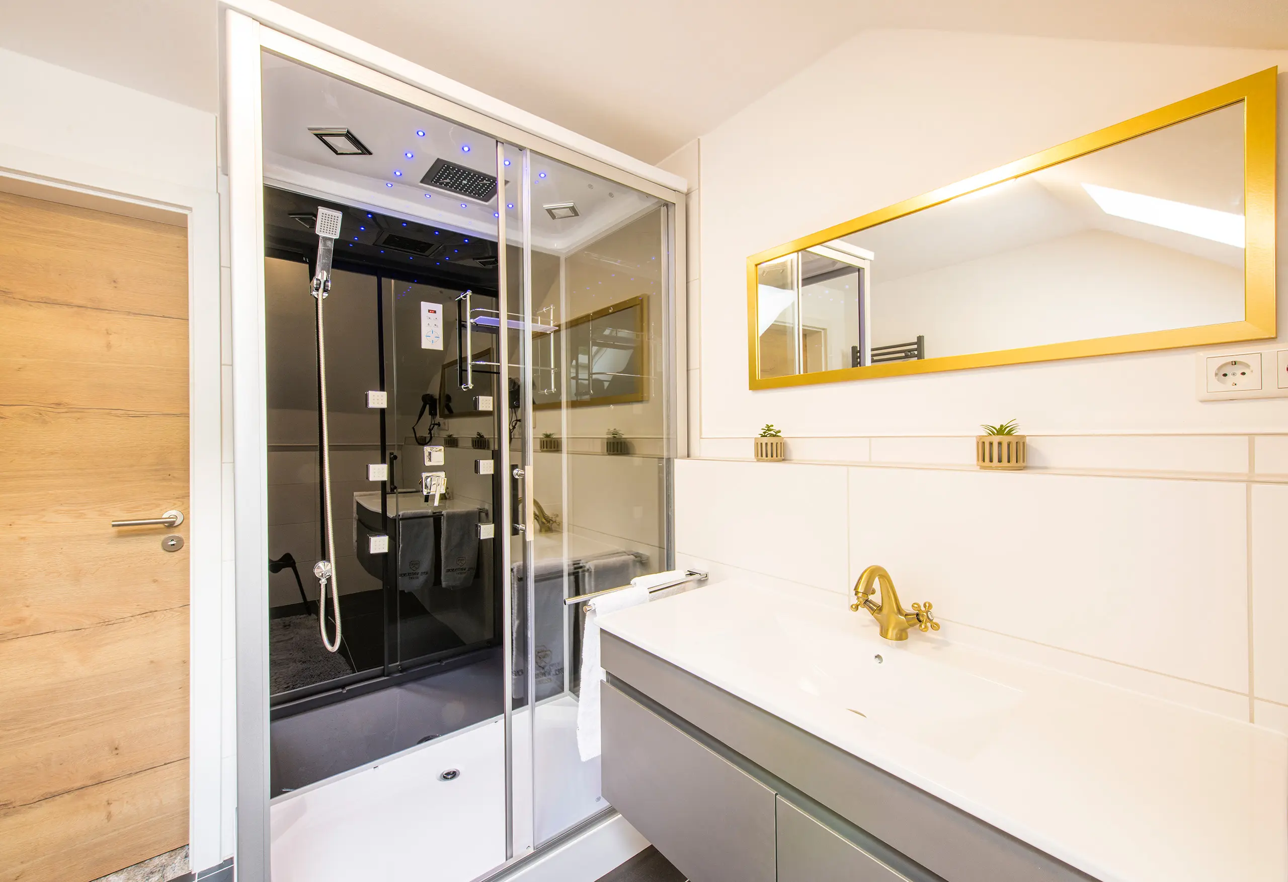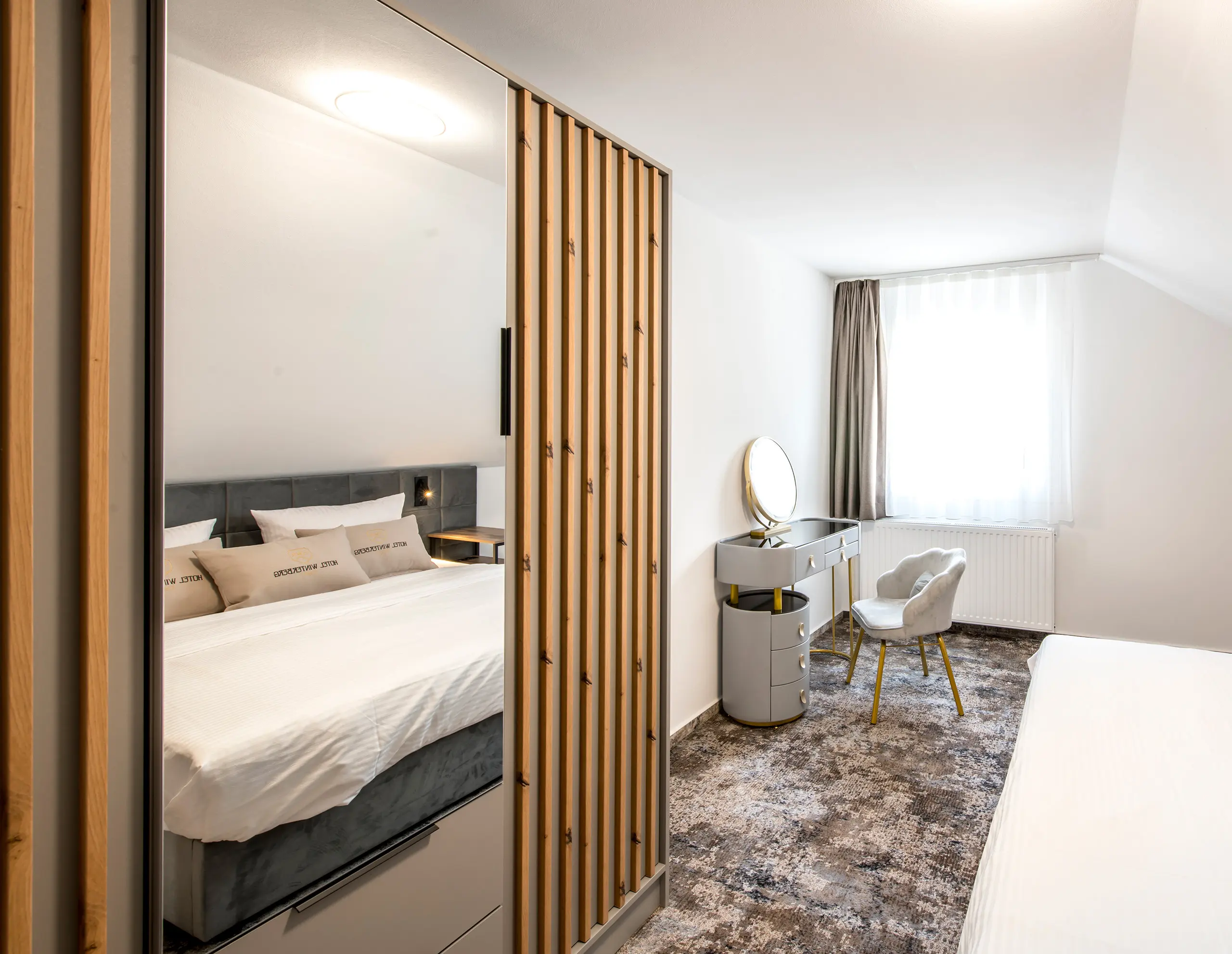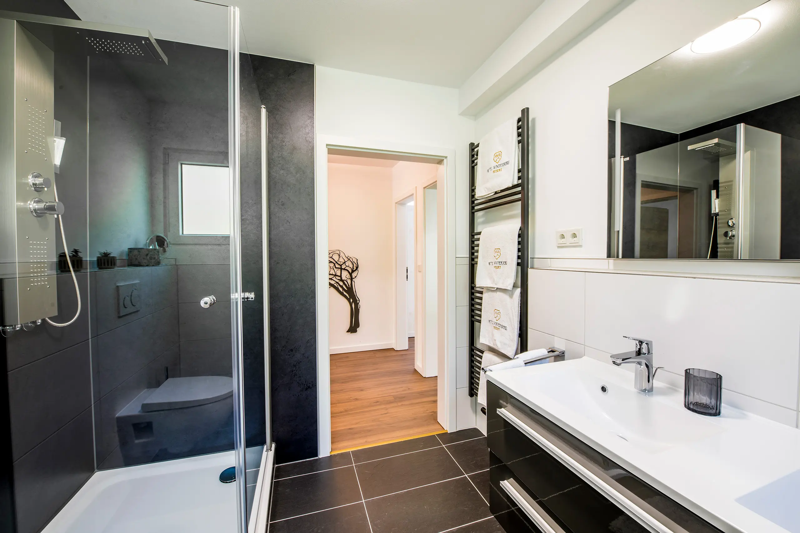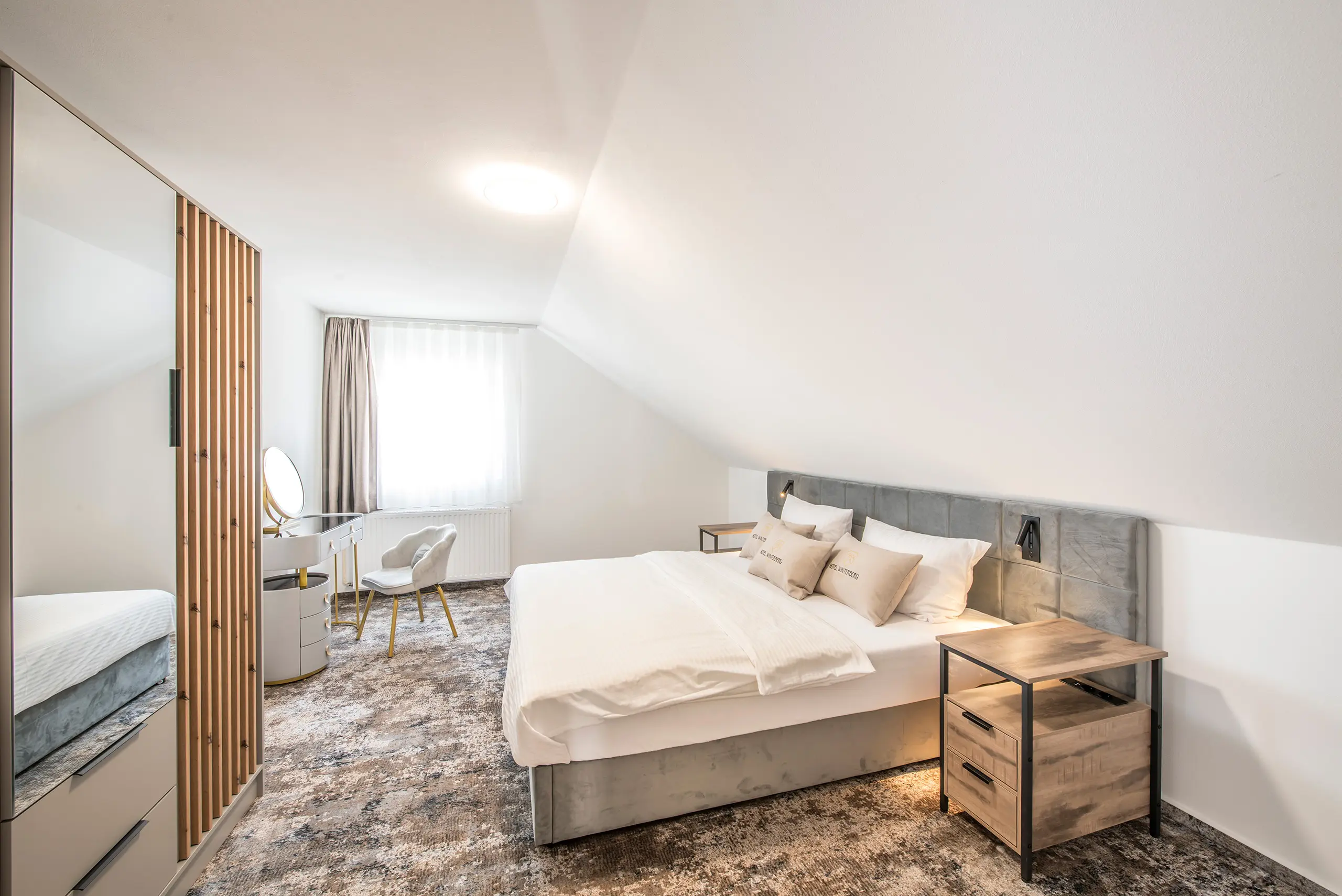 Diese geräumige, 90 m² große Ferienwohnung befindet sich im 1. Obergeschoss direkt gegenüber dem Hotel und bietet einen komfortablen und gut ausgestatteten Rückzugsort. Mit viel Platz und umfassender Ausstattung ist sie ideal für Familien oder Gruppen von bis zu 5 Personen.