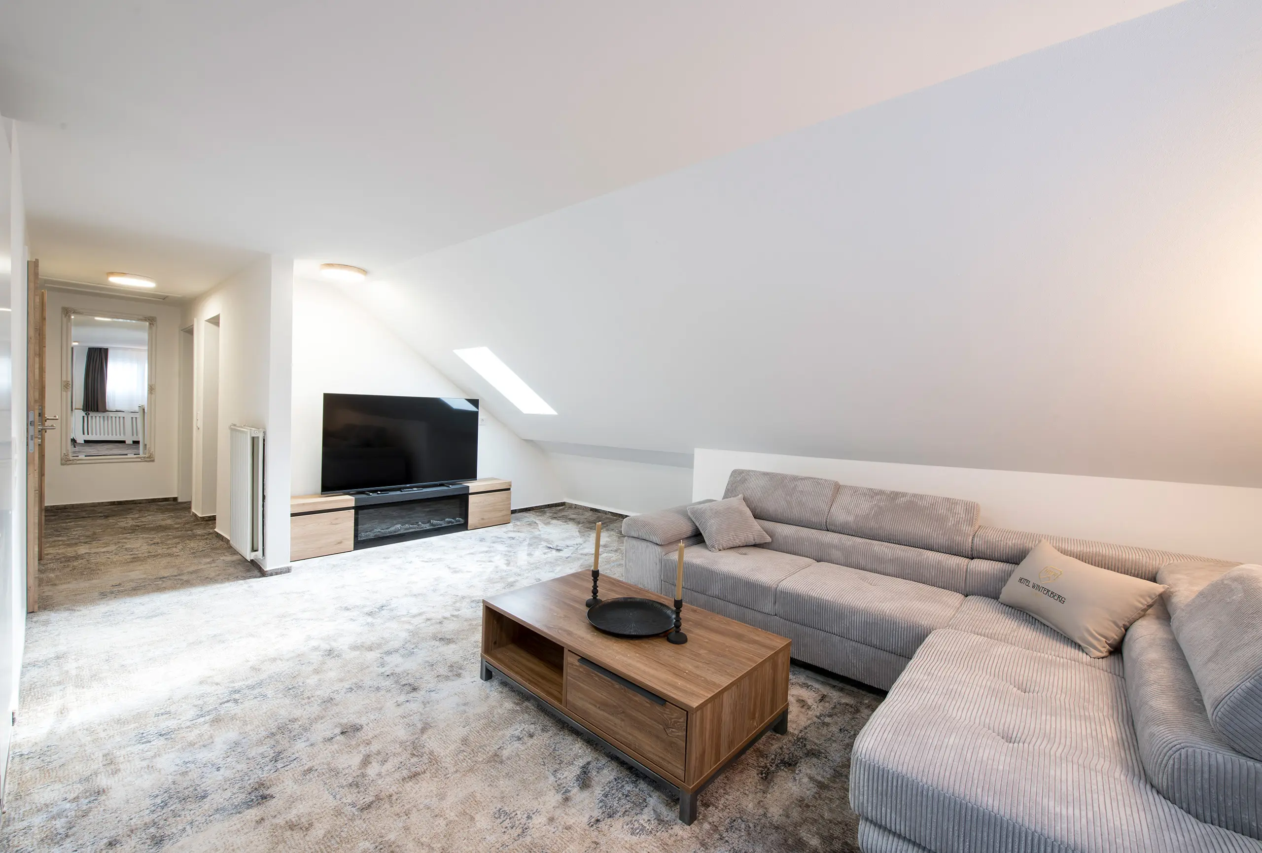 Wohnen & Entspannen: Der Wohnbereich lädt zu gemütlichen Abenden ein und verfügt über ein großes Sofa, einen Flachbildfernseher und einen Kamin, der für eine warme Atmosphäre sorgt.